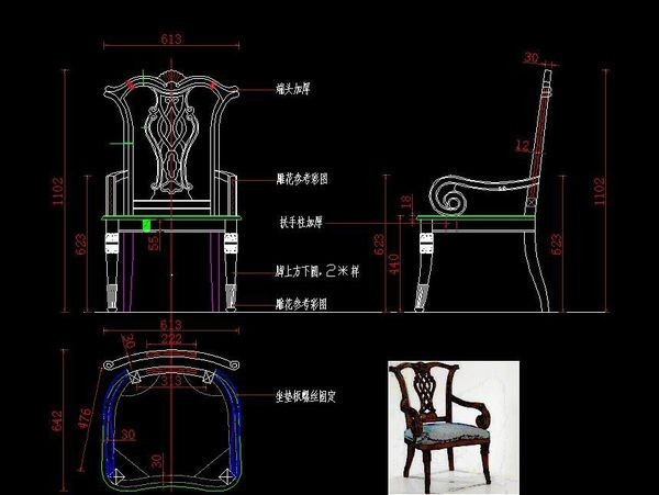家具设计图的主视图的选择要能够充分显示出家具的主要形状特征,因此家具一般以家具正面作为主视投影的方向,但是椅子、沙发经常把侧面当作主视图投影方向;如果要表达倾斜面的形状,则用斜视图表达;仅某一局部表达,则按照局部视图画法绘图。