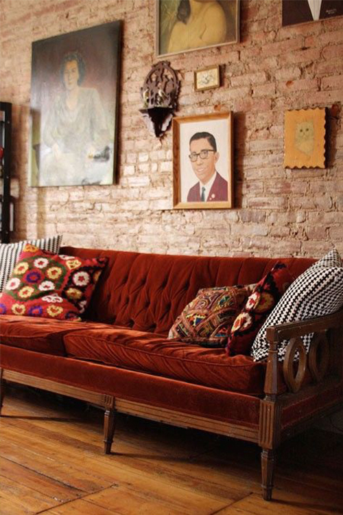 10 ▲ 裸砖墙和砖红色的沙发,再配上同色系复古靠垫,最后两边各摆一个黑白系靠垫强调轮廓。