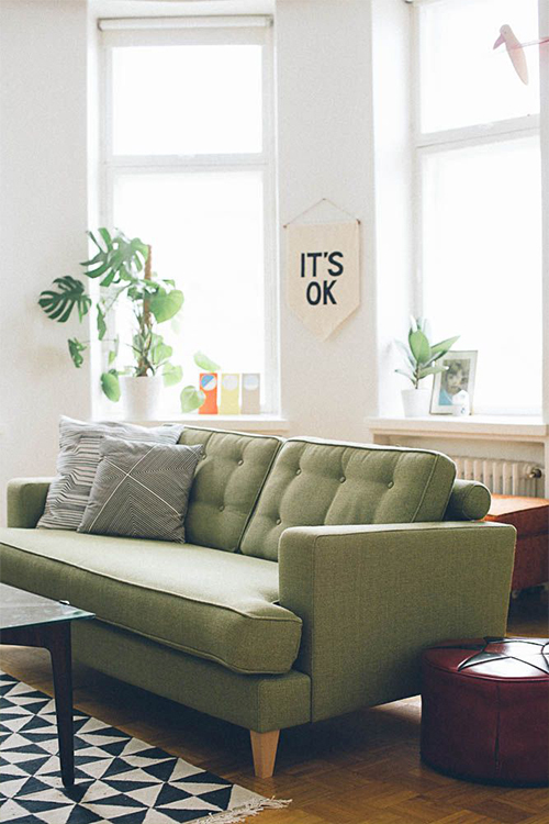 沙发是绿+白,靠垫也选用百搭的纯色黑白灰,那一个绿色靠垫就显得格外点睛,这样真的不会搭错。