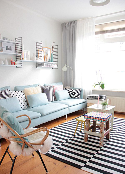 2 ▲ 马卡龙色的沙发,搭配同样清新的马卡龙色靠垫,当然,百搭黑白灰靠垫的加入让沙发靠上去更舒服。