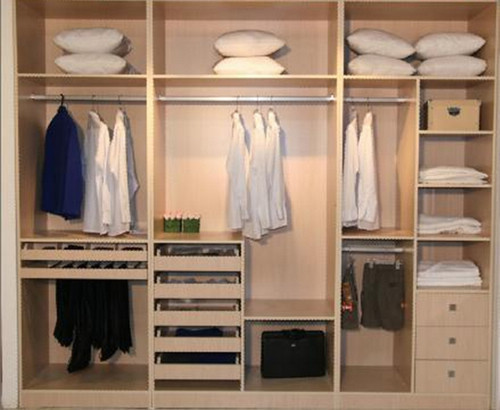 第四种衣柜板材是细木工板,细木工板(大芯板):防潮效果好,不能直接刷漆,细木工板的中间是以天然木条粘合而成的芯,两面粘上很薄的木皮,顾名思义大芯板,是装修中最主要的材料之一。可以做家具和包木门及门套、暖气罩、窗帘盒等,其防水防潮性能优于刨花板和中密度板。用大芯板制作的家具等木器要经过用胶粘板和刷漆两道工序,造价要高一些。大芯板按厚度分为3、5、9厘板,大家可以根据承受的压力和强度选用,越厚价格越高。