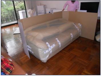 包装分为软包装和纸箱包装.国外的一般是纸箱包装,国内的一般是软包装. 1:所有外运沙发一律不装腿,腿是单独包装的. 2:软包装是里面一层塑料包装,然后边角上包上护角,外面再包一层纸皮,最外面包一层蛇皮代,然后写上型号,规格,颜色等等. 2:纸箱包装的是里面一层塑料包装,然后边角上包上护角,然后放进纸箱再把纸箱封上即可. 3:还有一种是用两无纺布中间夹毛毡做成的包装,那个打起来比较方便,里面只需一层塑料包装然后把这个往沙发上一套即可,对沙发的保护也好,但价格比较高. 4:如果是发往国外的切记里面要放干燥剂.