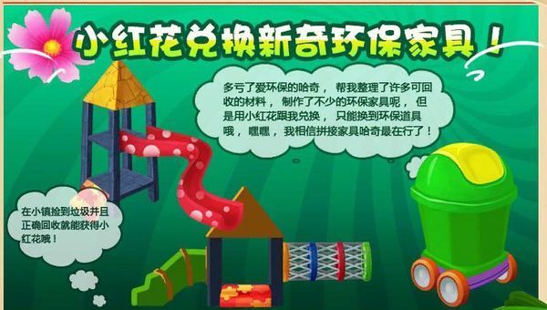 不是,那个是用小红花换的。捡垃圾,分类正确,就会得到一个小红花。滑滑梯和三个圈圈连起来的要20个小红花和18朵小红花。两层小亭子的要18朵小红花。兑换地点在休闲空地的绿色的垃圾处理器。 可以去地图上的图书馆看26期报纸。