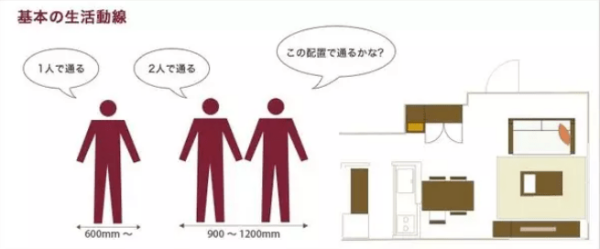 上图表示的是能够保证一个人通过的标准尺寸是600mm,两个人同时通过则为900~1200mm。当然这是家居的尺寸而不适用于公共建筑。