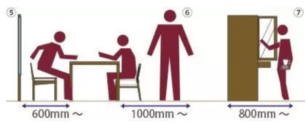 下图中,椅子周边:600mm以上;椅子+通道:1000mm以上;厨房收纳前:800mm以上。