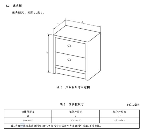 2、床头柜的标准尺寸见国家标准 GB/T 3327-2016《家具 柜类主要尺寸》: