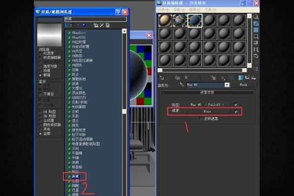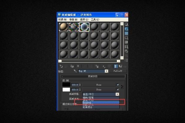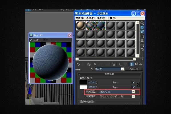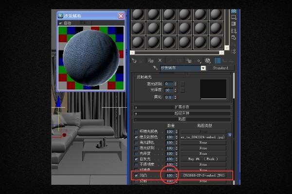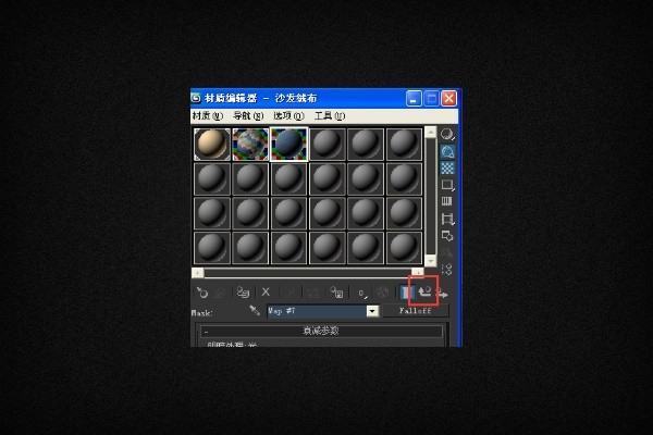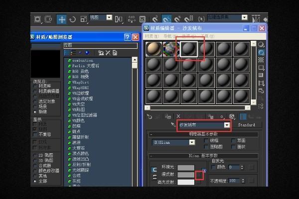 1.首先使用3Dmax打开100素材编辑器,选择空白素材球,命名为沙发或绒布,并添加漫反射的位图地图。