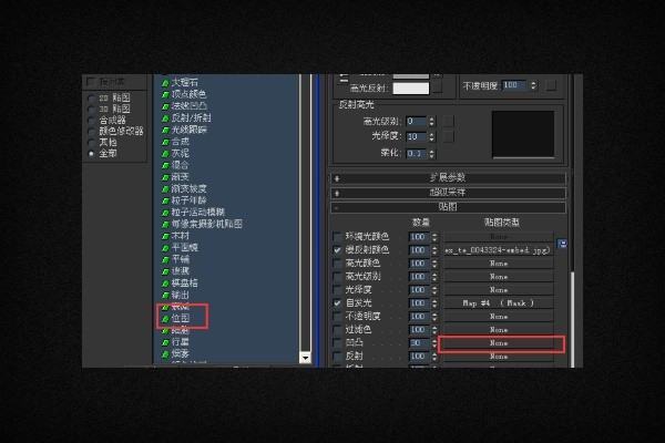 8.找到贴图卷展栏,将其展开,找到凹凸并点击后面的灰色框框为其添加一个位图贴图。