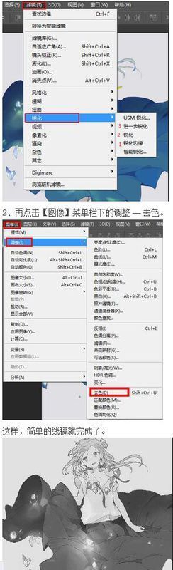 把手绘图用Photoshop处理成线稿,操作如下(CS6):
