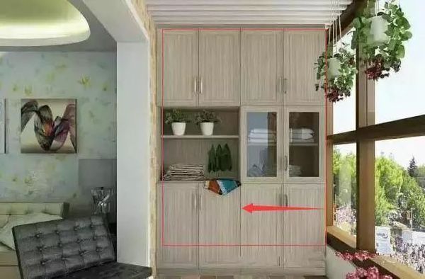 阳台,基本上都是家里的晾晒区,一般底部是洗衣机一体柜,墙壁上方也建议大家装上吊柜,直接到顶,这样方便放置洗衣用品。或者收纳一些过季的,不常用到的物品等,很实用。但慎重使用百叶窗柜门,漂亮是漂亮,落了灰尘也难清洁。