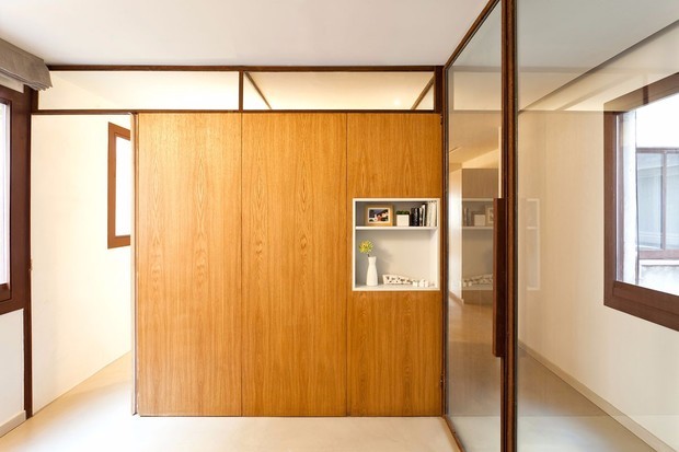 入户后不是直接进入房间,而是在侧面。有效的保护隐私,这个拐角也让入户更有仪式感。拉迷会在转角处设计双面柜,加厚层板,一墙两用,一柜两面,内嵌式设计,不多占用空间,玄关收纳柜、客厅展示柜、餐边柜同时get。