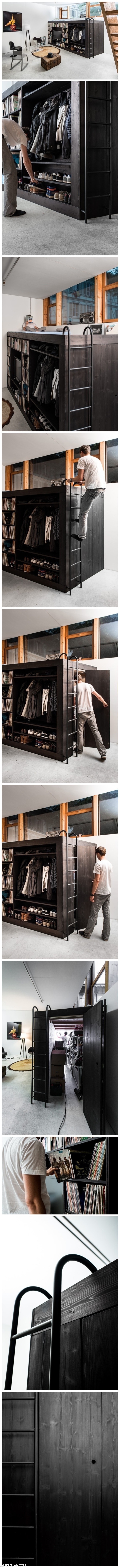 设计师Till Knneker带来了简约和多功能的立方体起居柜(The living cube)的设计。立方体的前方可用来摆放以及收纳电视、书籍、衣物鞋子或其它杂物,便于取放;沿着小梯子爬上去的顶部是客卧;而内部则是一个宽阔隐蔽的杂物储藏间。