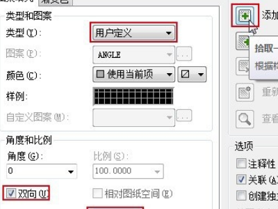 3、在“用户定义”中,勾选“双向”,间距设置为800。单击“添加拾取点”按钮。在图纸中拾取一个需要填充区域的内部点。然后回车确定。