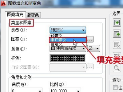 2、H+回车,打开图案填充对话框。填充类型选择“用户定义”。