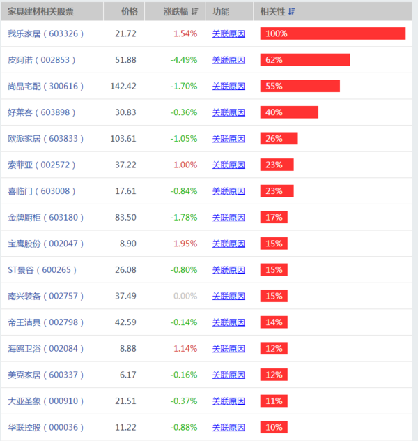 家具建材概念一共有31家上市公司,其中14家家具建材概念上市公司在上证交易所交易,另外17家家具建材概念上市公司在深交所交易。