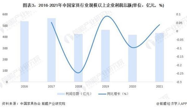 2016-2021年,中国家具行业规模以上企业利润总额整体呈波动递减趋势变化。2021年中国家具行业规模以上企业利润总额达433.7亿元,同比增长3.83%。