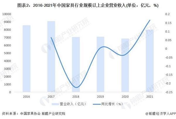 2020年,作为耐用消费品行业,家具行业受新冠疫情冲击影响较大。2020年我国家具行业规模以上企业营业收入6875.4亿元,同比下降6.0%。2021年家具行业规模以上企业营业收入有所判岩回升,达8004.6亿元,同比增长16.42%。