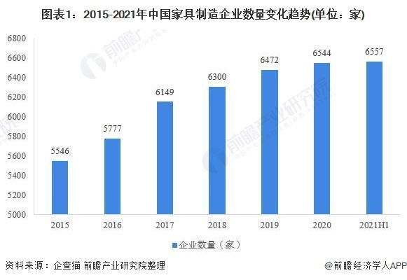 2015-2020年我国家具制造企业的数量呈稳步增长发展态势,但整体来看增速有所放缓,到2020年,全国家具制造企业数量达到6544家。截至到2021年6月,全国家具制造企业数量上升至6557家。