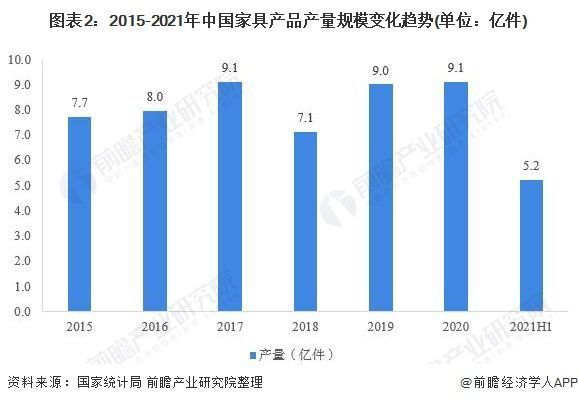 产量方面,近年来,我国家具产品产量规模呈现震荡走势,2015-2017年,全国家具产品产量持续提升,到2017年,全国家具产量为9.1亿件,随后几年产量先升后降,但仍为创新高。2021上半年,随着全国家具工业的复苏,中国家具行业产量为5.2亿件,同比增长30.1%。