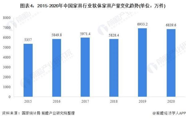 具体到细分产品来看,2015年以来,我国软体家具产品产量呈现震荡上行趋势,到2019年,我国软体家具产量首次突破六千万件。2020年中国软体家具产量为6839.6万件,同比下降1.4%。