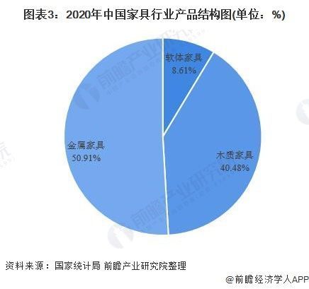 从细分市场来看,在家具分类中,我国主要以生产金属家具及木质家具为主。2020年中国木质家具产量占比为40.48%,金属家具产量占比为50.91%,两者产量合计占比超过90%;而木质家具产量占比仅为8.61%。