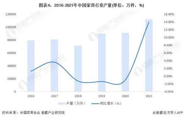 经过几十年的发展,我国家具行业已经从手工时代转变为现代规模化生产阶段,目前已经成为全球最大的家具生产国。2021年我国家具行业产量为111993.72万件,同比增长14.0%。
