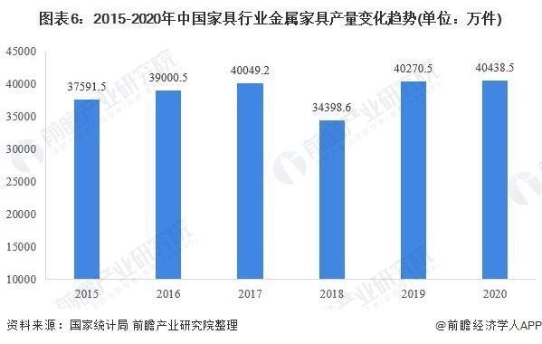 金属家具作为我国使用最为广泛的家具产品,在2017年产量已率先突破4亿件,自2018年产量下降之后,近两年产量持续回升,到2020年,全国金属家具产量为40438.5万件,同比增长0.4%,产量规模再创新高。