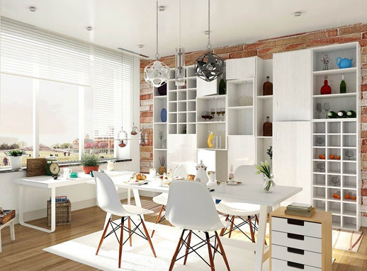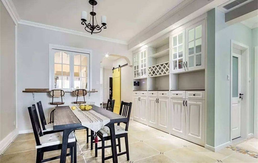 橱柜样式操作台延伸至餐桌旁。敞开式厨房,可以将部分橱柜功能延伸到餐厅中。把餐边柜当做备餐台,柜子上方安装层板,下面带有照态颂明灯,一些不需要烹饪的食物可以在这里制作完毕,端上餐桌。因为经常要在桌面上处理食物,所以在选择时注意桌面的材质是否好清洁。用于备餐台的餐边柜,柜子最好选择带有抽屉的款式,用于存放厨具。