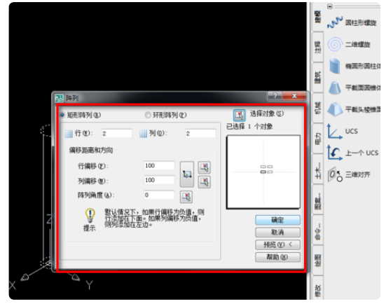 四、激活array命令并绘制其他三条腿。ar,输入,设置参数,行2,列2,行偏移100,列偏移100,角度0,选择绘制的圆柱体,输入,确定。