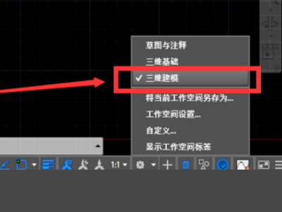 3、之后找到三维建模选项并单击,点击后cad的工作环境也就是三维的了。