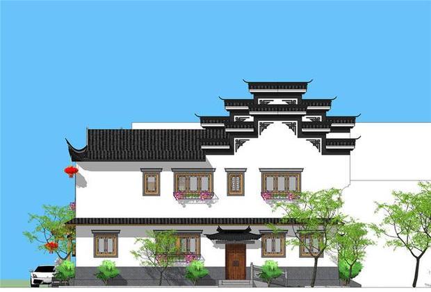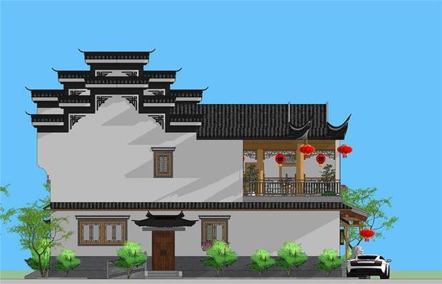 整体别墅建筑为徽派风格,立面上以粉墙黛瓦来展现传统建筑之雅,屋顶则使用了挑檐并搭配马头墙,提现了豪宅般的层次感和大气感。