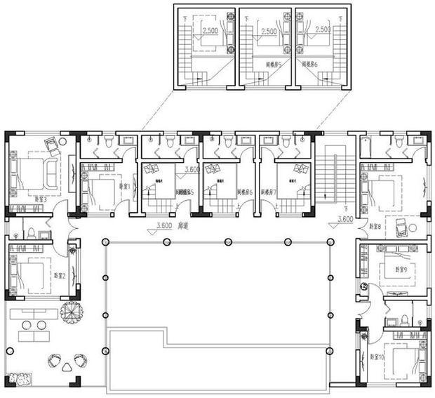 二层主要设计成器具空间,共计布置了12间卧室,且都配有独立卫生间。东西两侧各有一间套房,而西南角露台设置了露天观景场所。