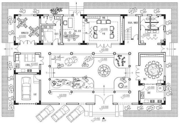 一层平面布局中,中堂被设置成了接待空间,并和书房茶室进行了连通,连通处以屏风和博古架进行了分隔,更显大气。在西南角设置了棋牌室,与老人房相邻,方便老人日常与人。车库被设置在了西南角和小厨房相邻。