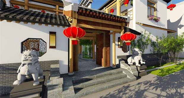 马头墙和墙体之上选用了条形装饰,并配上了大红灯笼,让徽派别墅有了视觉亮点,更有了红火的生活寓意,塑造出大户人家的既视感。