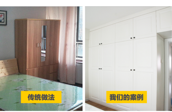 5、还有一个容易误导消费者的问题:什么叫量身订做?行内有一些厂家,做的都是固定格式的柜子,一组大的柜子由几个固定尺寸的独立柜子组合成,对外号称量身订做,但在各组柜连接处要用两块竖板,这样的柜子既浪费地方又浪费钱,而对于客户提出的质疑。