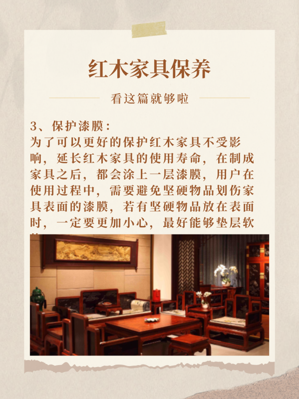 3、保护漆膜:为了可以更好的保护红木家具不受影响,延长红木家具的使用寿命,在制成家具之后,都会涂上一层漆膜,用户在使用过程中,需要避免坚硬物品划伤家具表面的漆膜,若有坚硬物品放在表面时,一定要更加小心,最好能够垫层软垫。