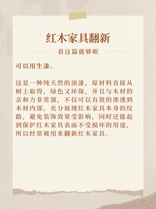 可以用生漆。亮带这是一种纯天然的油漆,原材料直接从树上取得,绿色又环保,并且与木材的亲和力非常强,不仅可以有效的渗透到木材内部,充分展现红木家具本身的纹路,避免装饰效果受影响,同时还能起到保护红木家具表面不受损坏的用途,所以经常被用来翻新红木家具。