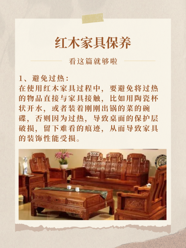 1、避免过热:在使用红木家具过程中,要避免将过热的物品直接与家具接触,比如用陶瓷杯状开水,或者装着刚刚出锅的菜的碗碟,否则因为过热,导致桌面的保护层破损,留下难看的痕迹,从而导致家具的装饰性能受损。