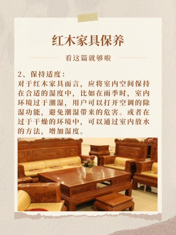 2、保持适度:对于红木家具而言,应将室内空间保持在合适的湿度中,比如在雨季时,室内环境过于潮湿,用户可以打开空调的除敬旦芦湿功能,避免潮湿带来的危害。或者在过于干燥的环境中,可以迟此通过室内放水的方法,增加湿度。