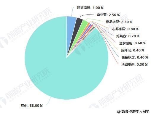 目前国内定制家居市场集中度仍然较低,根据2018年定制家居上市企业营收规模测算,2018年九家定制家居上市企业合计营收为347.56亿元,合计仅占国内定制家居市场的12%份额,其中欧派家居占4.0%,索菲亚占2.5%,尚品宅配占2.3%,行业集中度偏低。