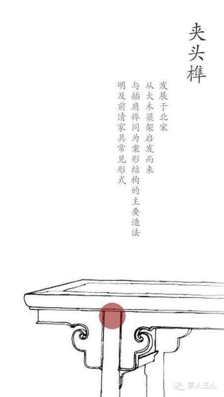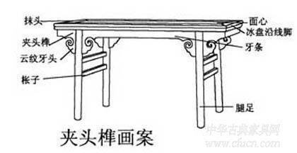 这是案形结体家具常用的一种榫卯结构。这种结构能使四只足腿将牙条夹住,并连结成方框,能使案面和足腿的角度不易改变,使四足均匀地随案面重量。长期以来,夹头榫经受了实用的考验,至今还在广泛使用。