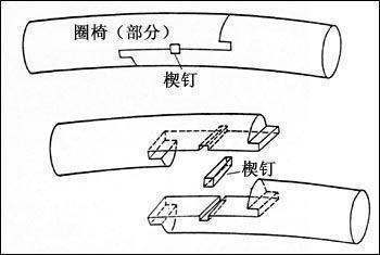 楔钉榫,又名销钉榫,别名钥匙榫。连接弧形材常用的榫卯结构,它把弧形材截割用上下两片出榫嵌接,再在中部插入平行四边形的楔钉,能使连接材上下、左右不错移和紧密的接合连成。