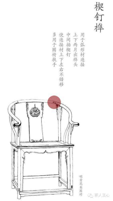 基本做法:两片榫头交搭,同时榫头上的小舌入槽,使其不能上下移动。然后在搭口中部剔凿方孔,将一枚断面为方形,一边稍粗,一边稍细的楔钉插贯穿过去,使其也不能左右移动即可。楔钉榫多用于圆型家具如香几、坐墩、圆杌凳等面子的边框组构,以及圈椅“月牙扶手”的拼接。