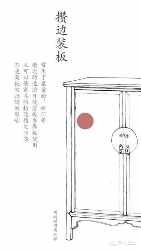其具体做法:木框四根,两根长而出榫的叫“大边”,两根短而凿眼的叫“抹头”。在木框的里口打好槽,以便容纳木板的边簧(在拼板的四周刨出的榫舌)穿带出头部分则插入大边上的卯眼内。这样即可以用“攒边打槽装板”的方法把木板装入木框。