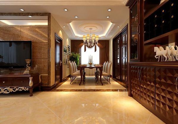 亮点:富有光泽感的家具,浅色系的地砖,充满艺术气息的水晶吊顶,展现出一个雍容大气,优雅别致的新古典家居。