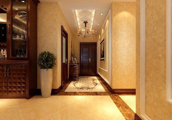 ▲ 门厅注重层次感,墙面的线条造型装饰凸显出新古典的情怀,挂画以深色为底,墙面贴暖色系壁纸,强调了空间带来的视觉冲击。