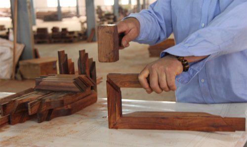 组装环节,是红木家具榫卯结构的演绎阶段,凭借工艺师丰富的经验,精湛洗练的技艺,家具的组合装配往往浑然一体,天衣无缝。组装环节是对红木家具榫卯结构的直观演绎,突显了红木家具榫卯结构这一奇异的特征。既互相避让,又相辅相成的各种各样的榫子在组装过程中犹如小精灵,灵活,自然,取代了钉子、胶水的生硬,创造出了精巧绝伦的榫卯传奇。