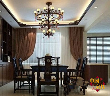 一般来说,窗帘是红木家具的点缀,因此它的色彩不能过于花哨,否则可能造成杂乱无章,甚至喧宾夺主的失败效果。