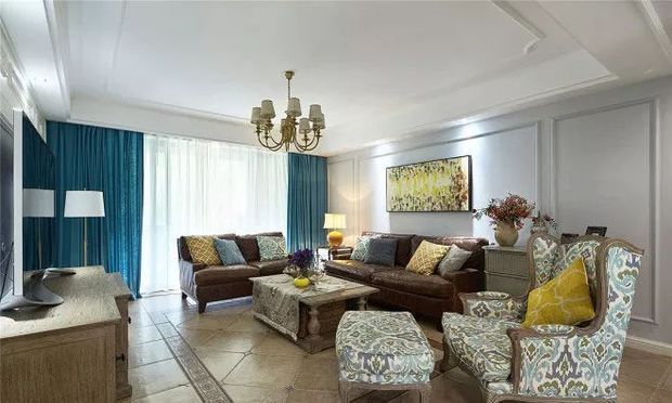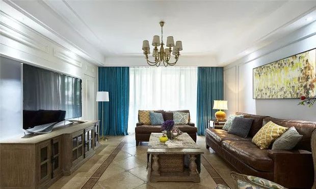 美式田园风格为了表现贴近自然的特点,家具选用上都会采取深红棕色的实木色彩,并且木面装饰上常常有天然纹路,比方寄存柜、茶几、电视柜等。其中寄存柜并不是全封闭式,而常常具有展现摆设品的作用,因此会装有透明玻璃或是设计成开放式。