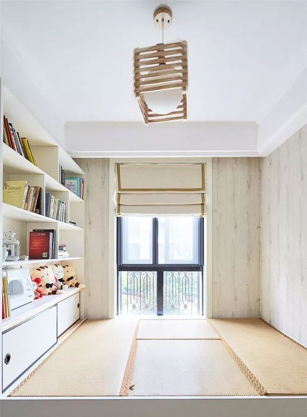 ▲次卧做成了榻榻米书房,榻榻米本身是收纳柜,再加上墙上的收纳架,可以说是很实用了。